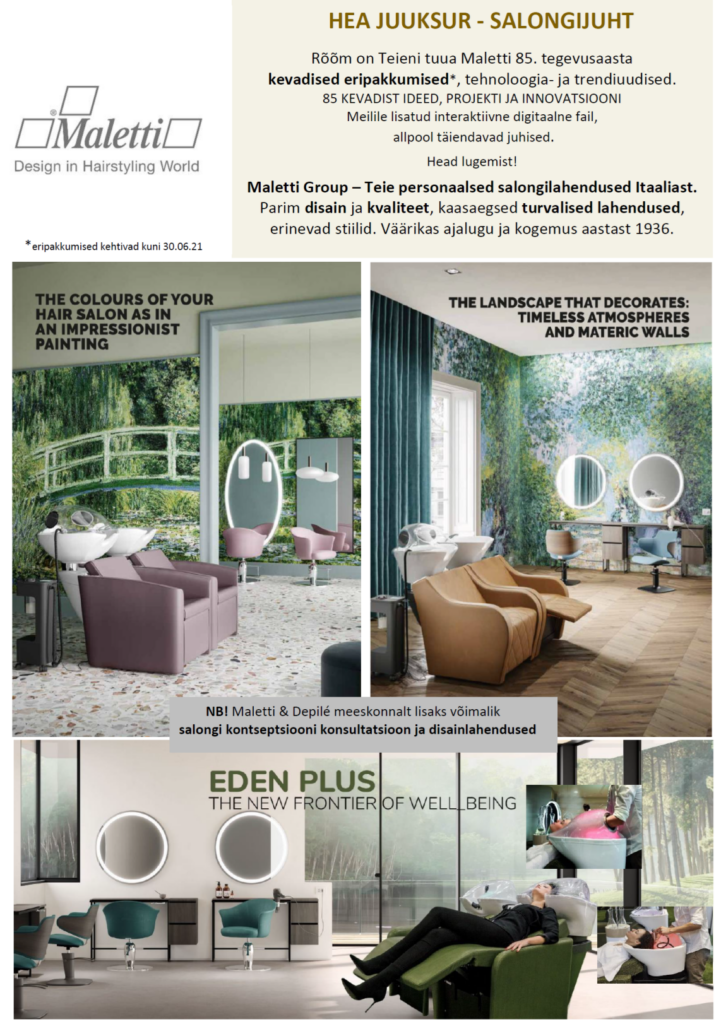 | ESILEHT klõpsates logole ja sisenete Maletti veebilehele Alljärgnevalt uudislehe – eripakkumise lehekülgede (LK) juhised. LK 4 UVC MINI TOTEM – klõpsake QR koodile ja avaneb video LK 5 INDEX – loend, klõpsake toote pildile ja avaneb vastav lehekülg LK 7 SKY WASH PRIMA CLASSE – kõlpsake pesukoha mudeli logole ja avaneb video + klõpsake Vapomist QR koodile LK 9 NEW 330 – klõpsake pesukoha logole ja vaadake videot LK 10 EDEN Klõpsake QR koodile ja avaneb video Klõpsake EDEN puldile ja avaneb Vapomist | LK 12 AMBIENCE TWIGGY Klõpsake katte värvile ja näete erinevat värvilahendust LK 13 LAZZARO COLOR Klõpsake Vapomist pildidle ja avaneb vastav lehe lõik LK 14 CORNER BARBER Klõpsake pildi QR koodile ja jõuate veebile Klõpsake Zeus Easy QR koodile LK 15 AREA MANICURE Aktiveerige QR kood LK 16 LORD NELSON Klõpsake Nelsoni puldile LK 17 UVC MANHATTAN Klõpsake QR koodile LK 19 LAZZARO BLACK Klõpsake Vapomist LK 22 THE BEST SALON Klõpsake pealkirjale “The best Salon”, avanevad salongide galeriid. |